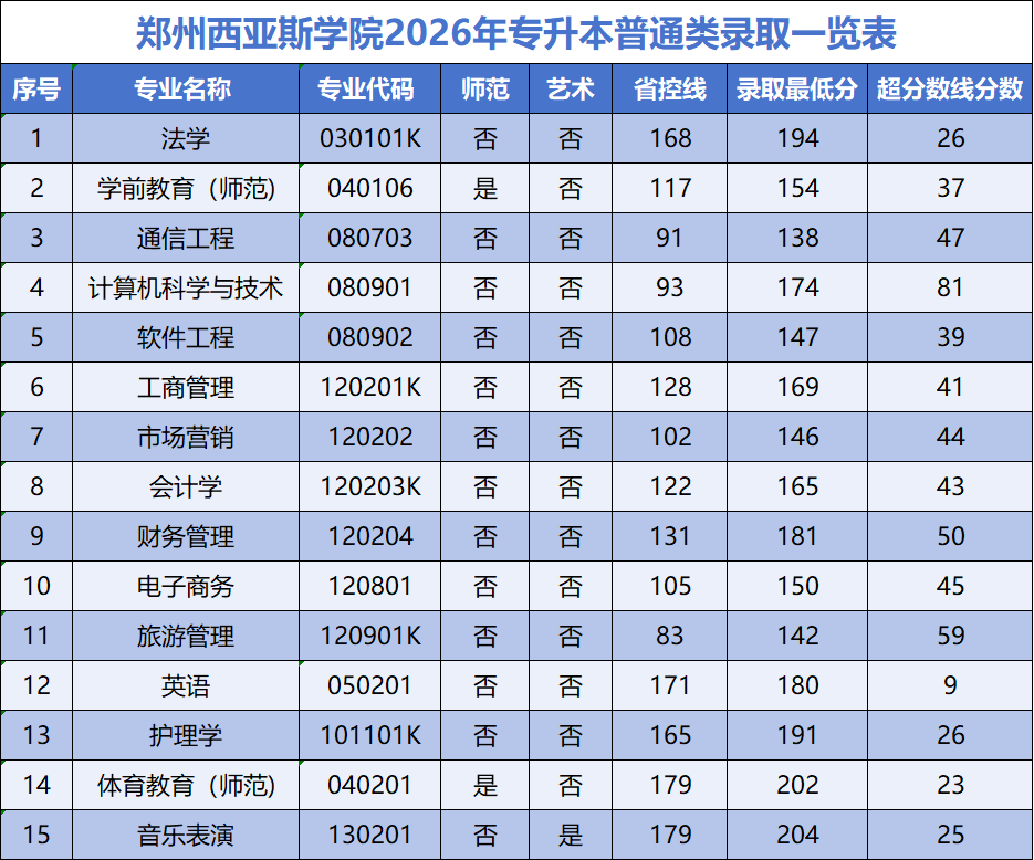 本表仅统计郑州西亚斯学院2026年专升本普通类录取数据。